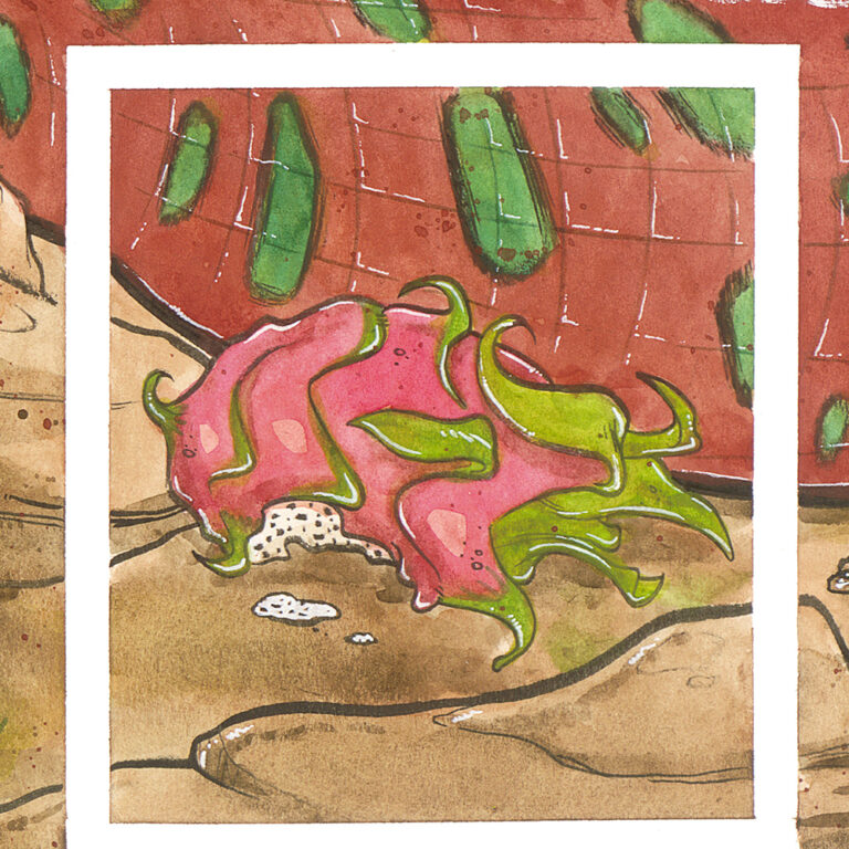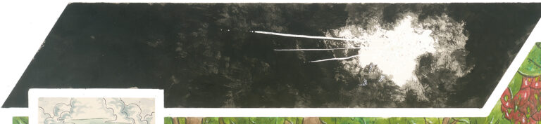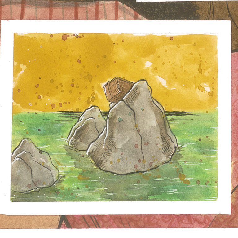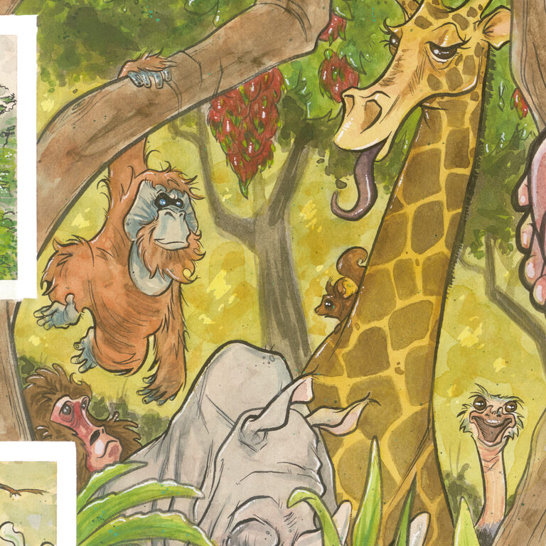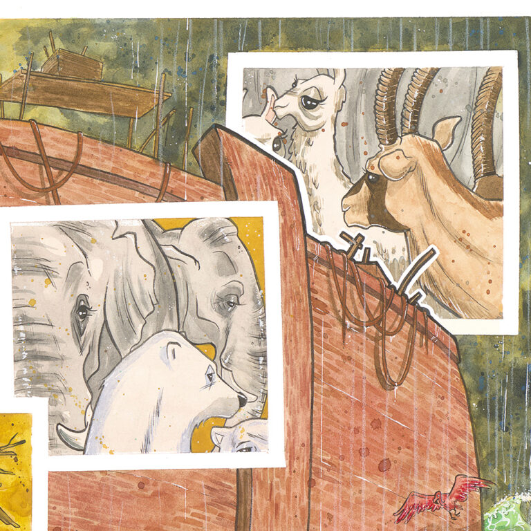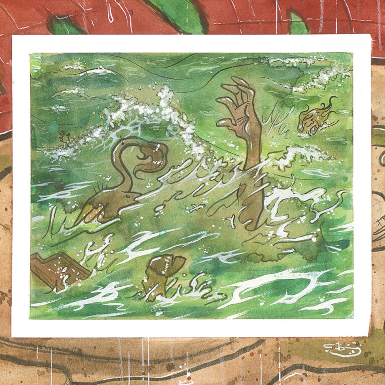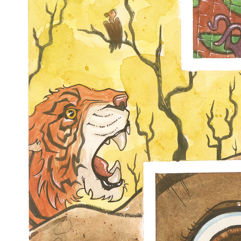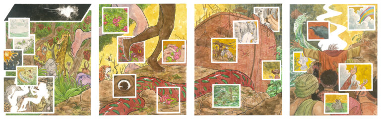 Recently, I completed a multi-paneled work for my newest nephew. It measures out at 20 inches tall and 64 inches wide, it’s done in watercolor and ink (with a special guest appearance from white chalk), and it is one piece in four parts:
